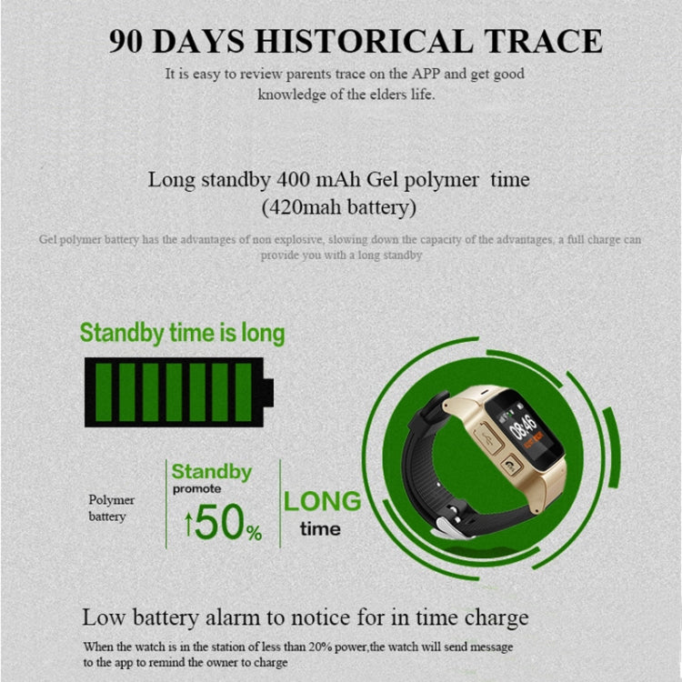 D99+ 1.22 inch HD LCD Screen GPS Smartwatch for the Elder Waterproof, Support GPS + LBS + WiFi Positioning / Two-way Dialing / Voice Monitoring / One-key First-aid / Wrist off Alarm / Safety Fence (Champagne Gold)