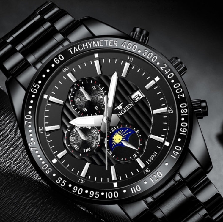 FNGEEN 5800 Men Three Eyes and Six Pins Watch Student Quartz Watch(White Steel Black Surface)