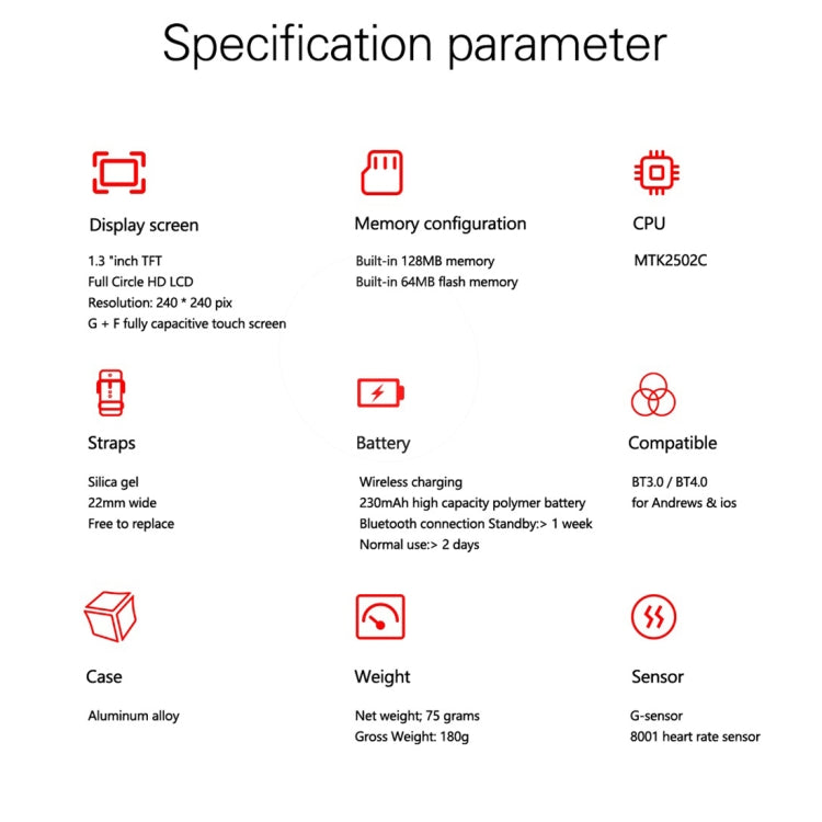 N6 Smart Watch 1.3 inch TFT Screen MTK2502C Bluetooth4.0, Silicone Watch Band, Support Heart Rate Monitor & Pedometer & Sleep Monitor & Sedentary Reminder(Red)